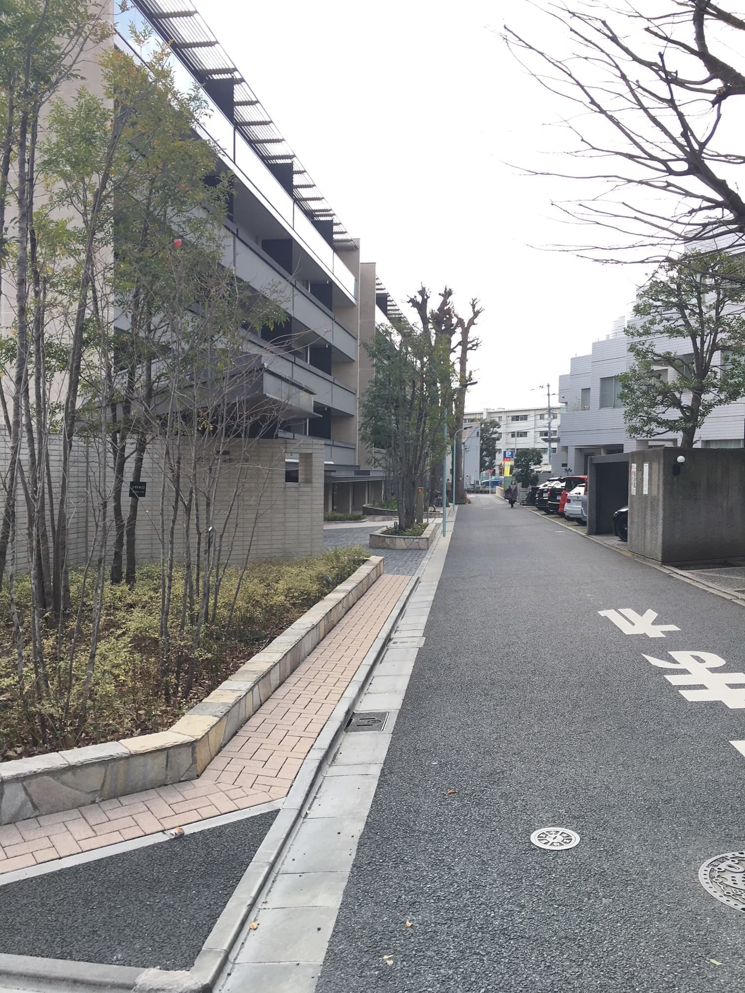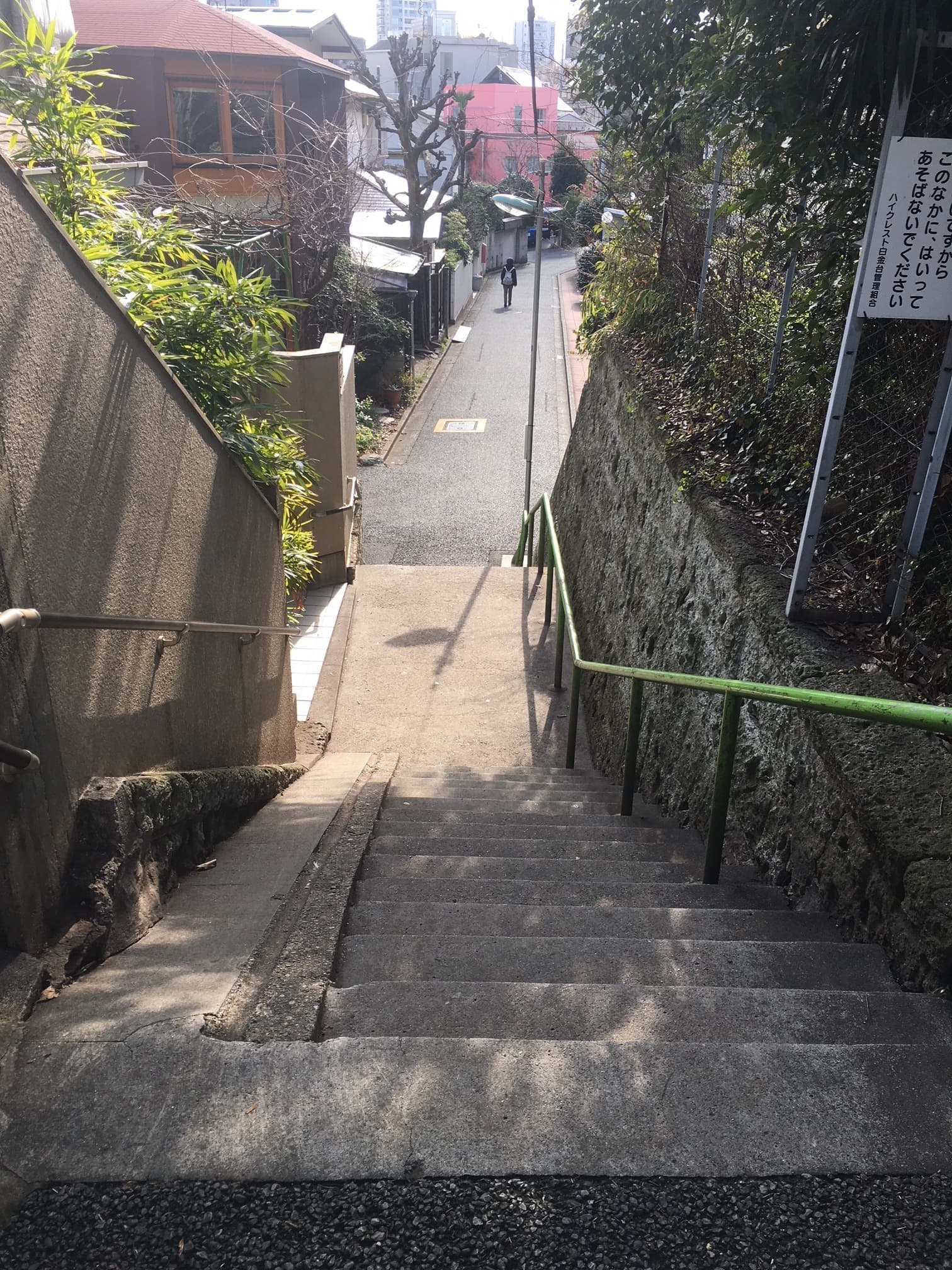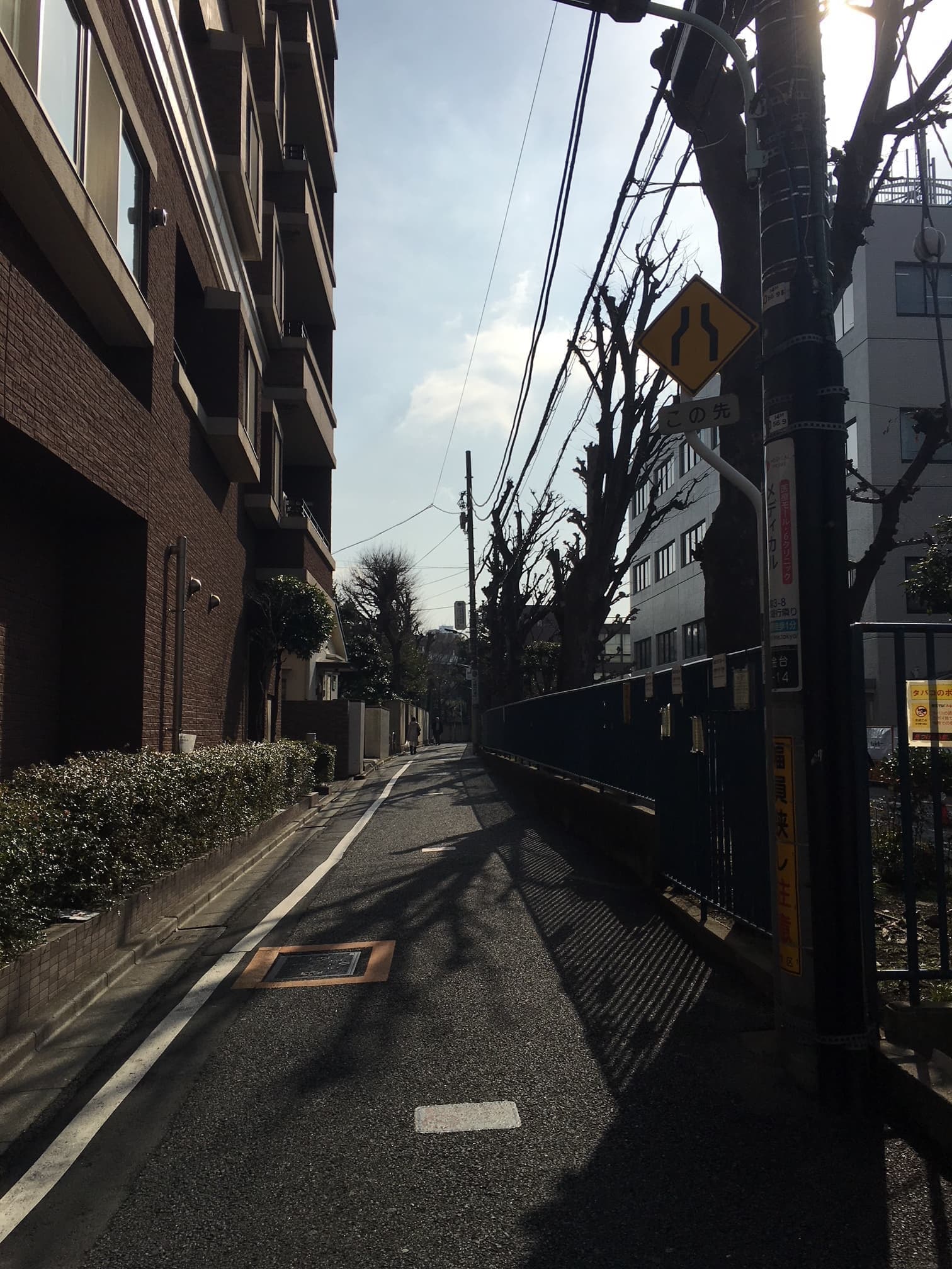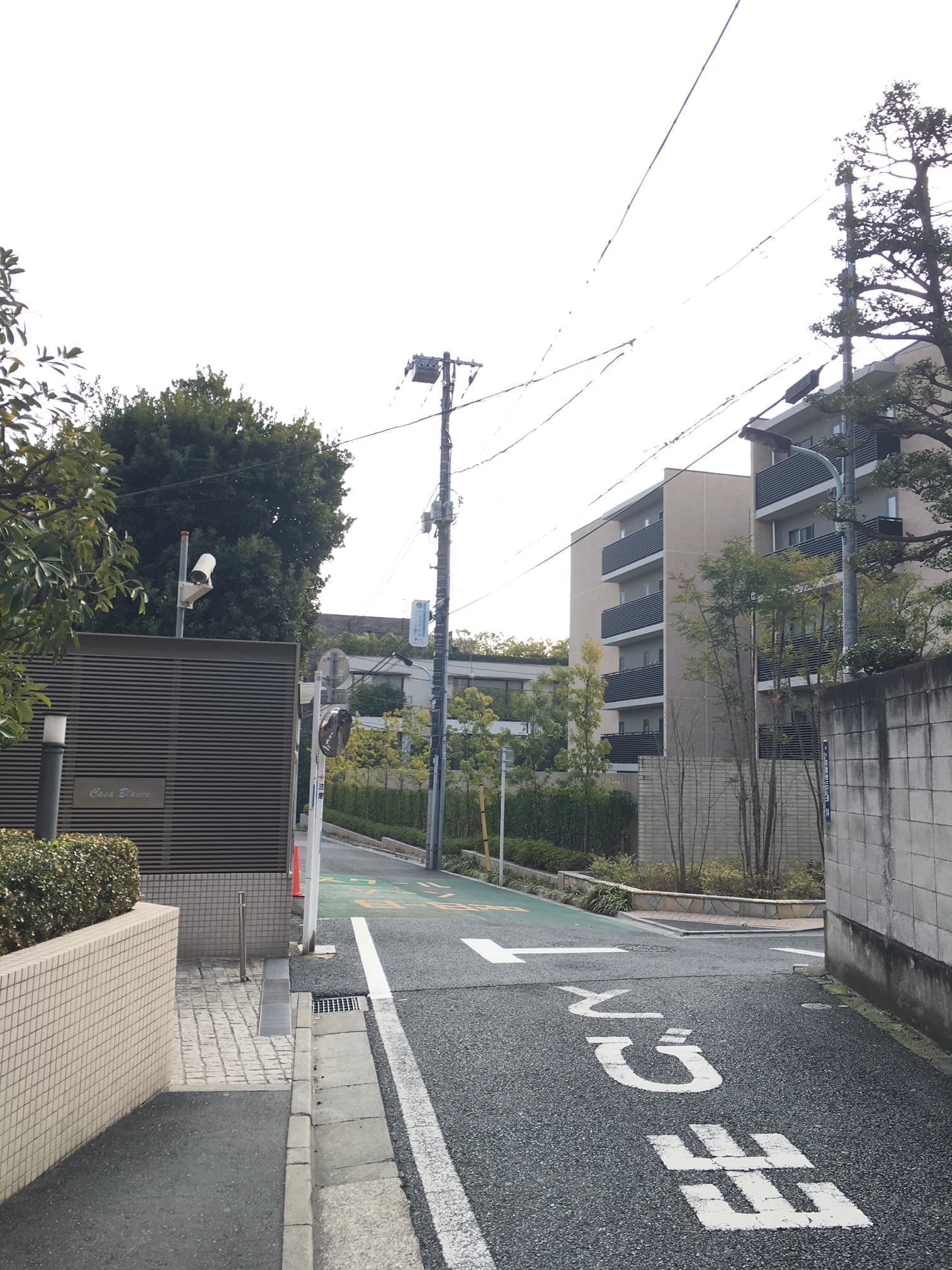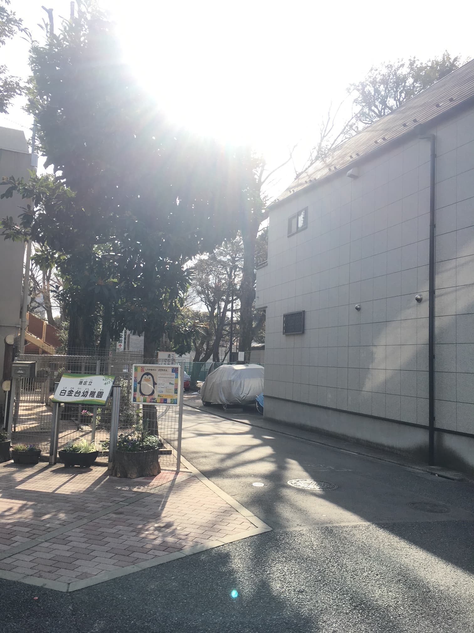 階段を下りますとすぐに左折、左側の高い壁沿いを10歩ほど進むと左手に白い建物がございます。「サルート白金台」こちらが目的地です